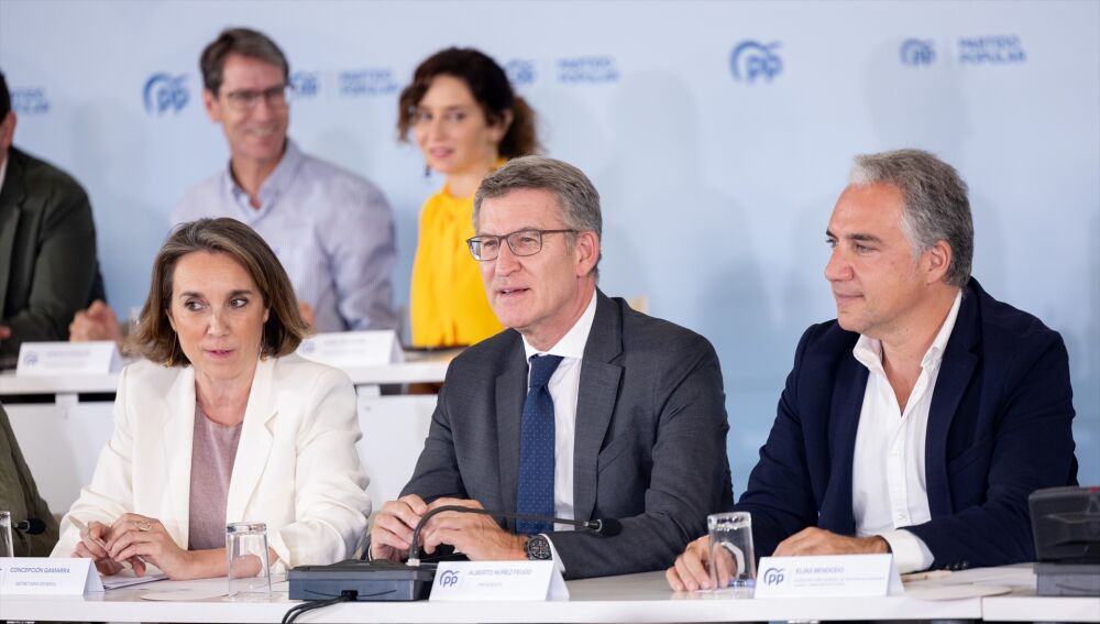 La secretaria general del PP, Cuca Gamarra; el líder del PP, Alberto Núñez Feijóo y el vicesecretario de Coordinación Autonómica y Local del PP, Elías Bendodo, durante la Junta Directiva Nacional del Partido Popular | Europa Press
