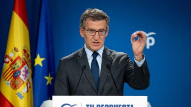 El líder del PP, Alberto Núñez Feijóo, durante una comparecencia de prensa, tras cerrar el PP y el PSOE el pacto para renovar el Consejo General del Poder Judicial (CGPJ), este martes en Madrid | EFE/ Daniel González
