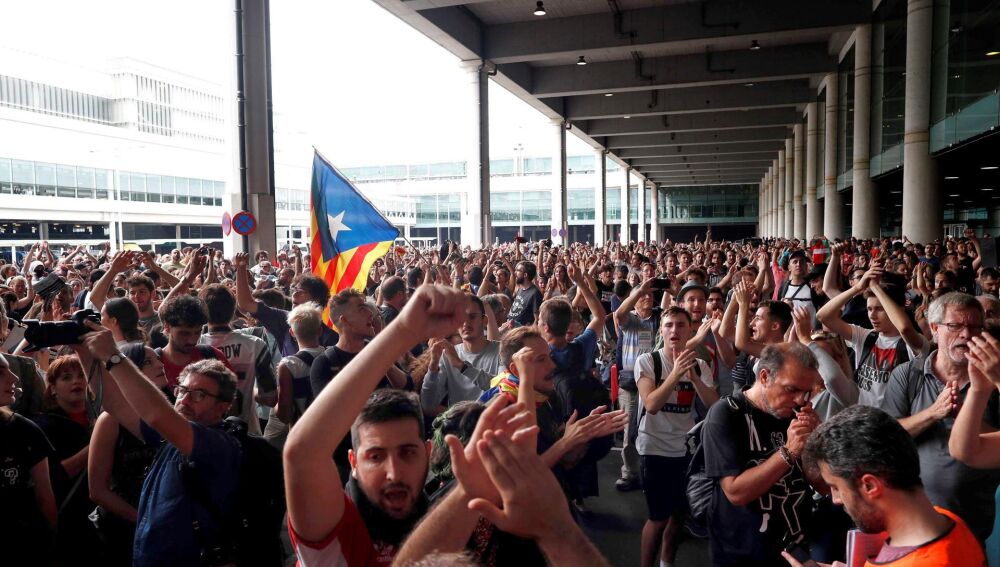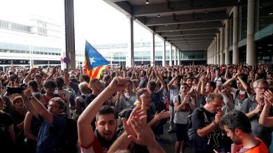 Protesta convocada por Tsunami Democràtic para paralizar la actividad del aeropuerto del Prat. | EFE/Alejandro García