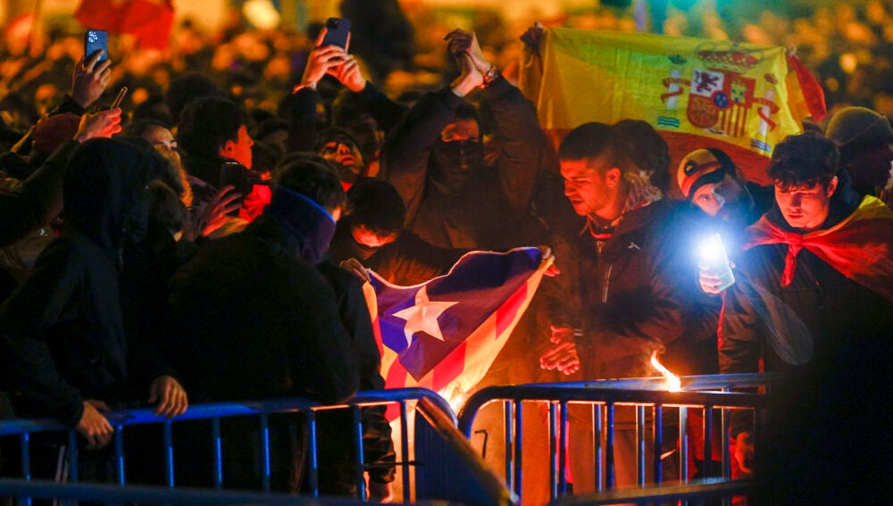 Además los concentrados han quemado varias banderas esteladas, símbolo de los independentistas catalanes.