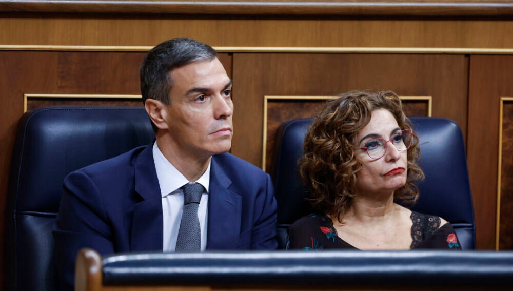 El presidente del Gobierno, Pedro Sánchez con la ministra de Hacienda y vicepresidenta María Jesús Montero durante la sesión de control al Gobierno celebrada este miércoles en el Congreso. | EFE/Javier Lizón