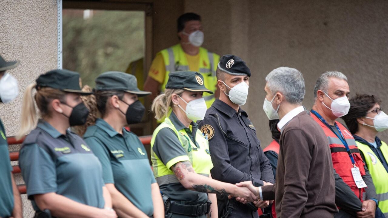Grande-Marlaska también se ha reunido con parte de los 271 agentes de Policía Nacional y Guardia Civil integrados en el dispositivo de Protección Civil en tareas de auxilio a la población civil de La Palma, a quienes les ha mostrado su agradecimiento y el reconocimiento de la sociedad española por su trabajo durante estas semanas.
