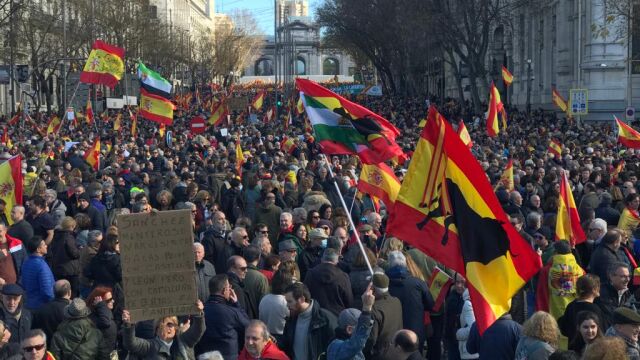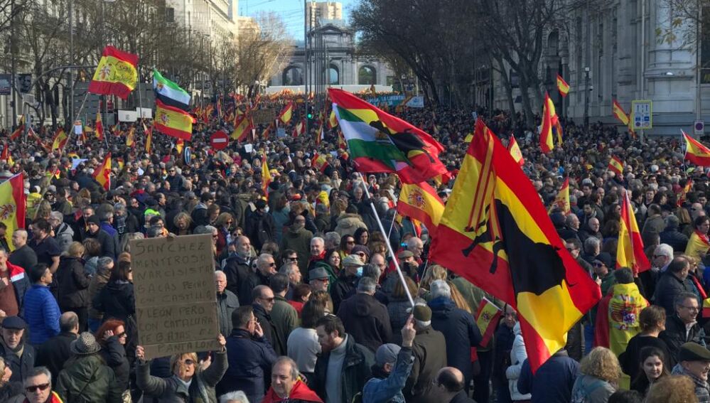 Miles de personas se congregaron este sábado portando la bandera española en la madrileña Plaza de Cibeles y sus inmediaciones para protestar contra las políticas del presidente del Gobierno, Pedro Sánchez.