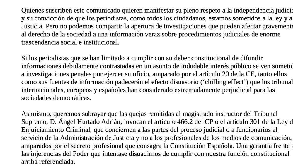 En el comunicado también se subraya que las quejas que han motivado las diligencias contra los periodistas aluden a preceptos legales —como el artículo 466.2 del Código Penal o el 301 de la Ley de Enjuiciamiento Criminal— que se refieren a partes del proceso o a funcionarios de la Administración de Justicia, no a informadores protegidos por el secreto profesional.