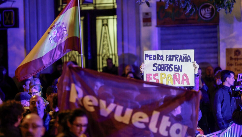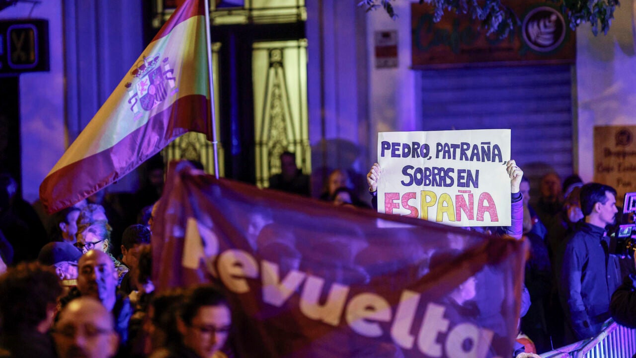 Un grupo de ciudadanos se ha manifestado este sábado por segundo día consecutivo en los aledaños de la calle Ferraz, donde se encuentra la sede del PSOE, para protestar contra la Ley de Amnistía que el Ejecutivo negocia con Junts para investir a Sánchez.