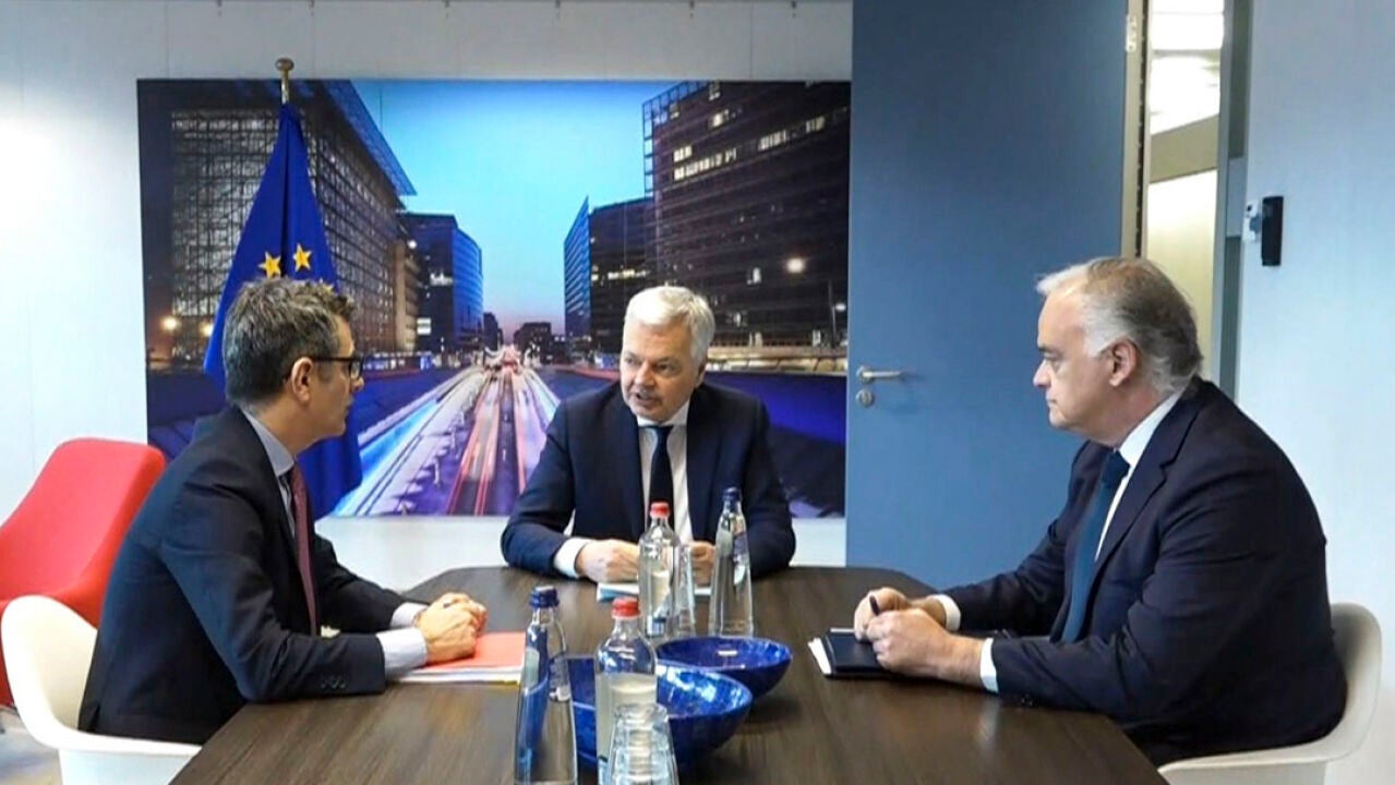 El comisario de Justicia europeo, Didier Reynders, ha reunido este miércoles en Bruselas al ministro de Presidencia y Justicia, Félix Bolaños, y al vicesecretario de Acción Institucional del PP, Esteban González Pons | EFE/Pablo Garrigós