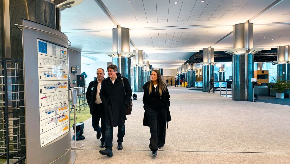 El expresidente de la Generalitat, Carles Puigdemont, acompañado de Jordi Turull y Miriam Nogueras en el Parlamento Europeo | Europa Press