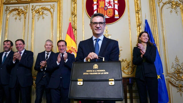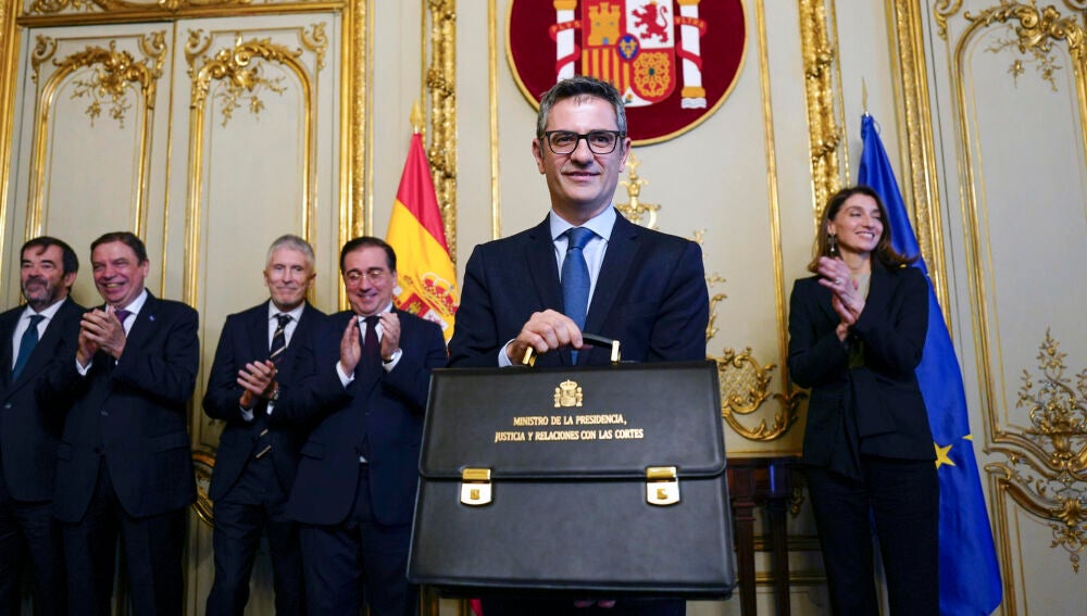 No ha mencionado la Ley de amnistía pero el repleto salón ha entendido con claridad que el mandato con el que aterriza Félix Bolaños en el Ministerio de Justicia responde a planteamientos firmes. Quizá más firmes que su pulso; metáfora o no, durante un instante fugaz al superministro se le resbaló de las manos la mismísima cartera recién entregada por Pilar Llop, aunque en cuestión de segundos se las apañó para recuperar la postura y la amplísima sonrisa.