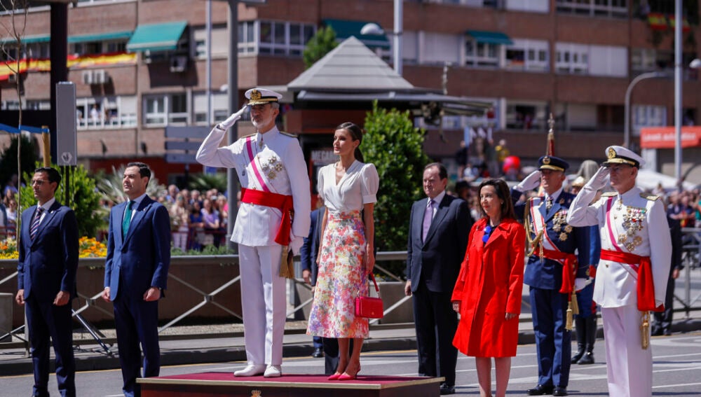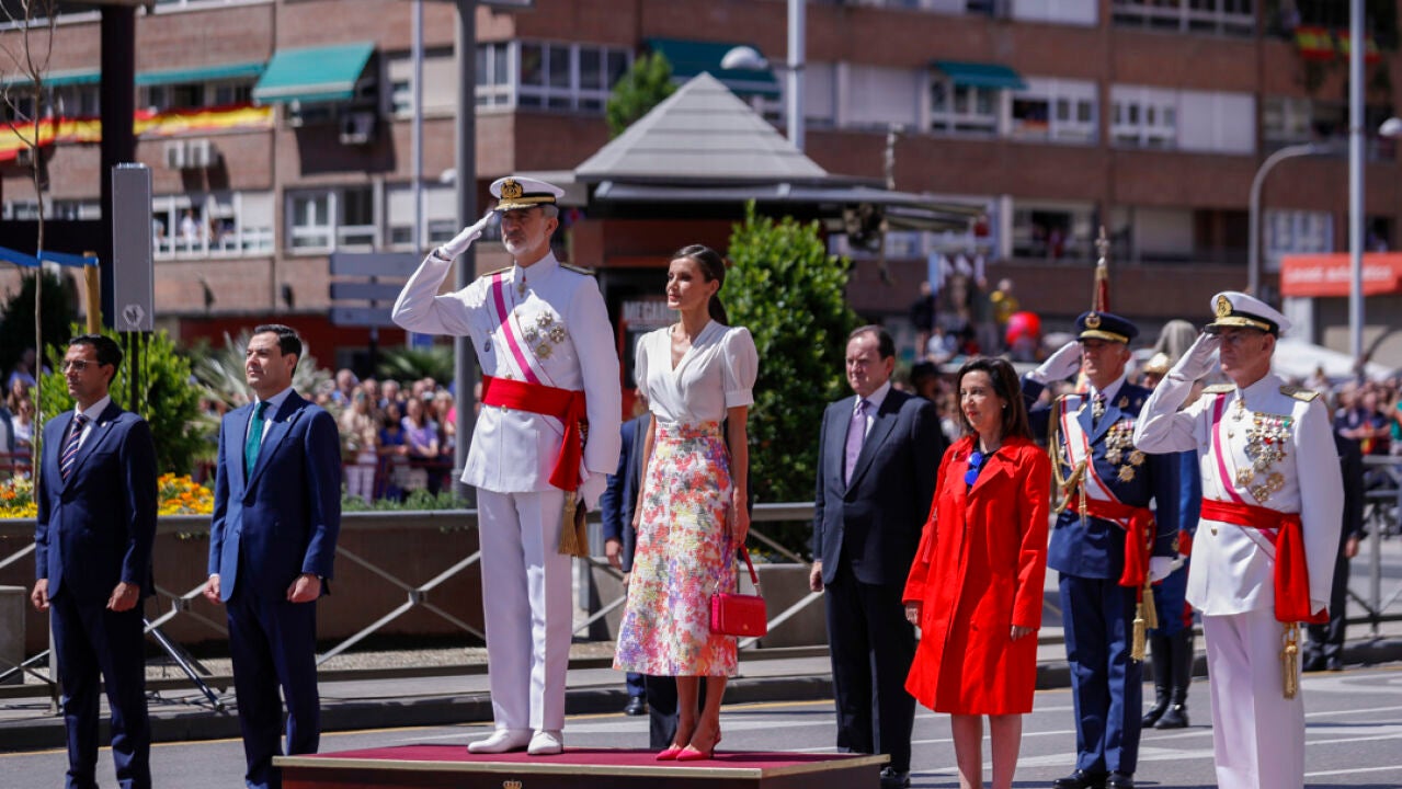 Los reyes Felipe y Letizia han presidido el acto central acompañados de la ministra de Defensa, Margarita Robles, el jefe del Estado Mayor de la Defensa (Jemad), el almirante Teodoro López Calderón; el presidente de la Junta de Andalucía, Juanma Moreno, y el alcalde en funciones de Granada, Francisco Cuenca, además de otras autoridades militares y civiles