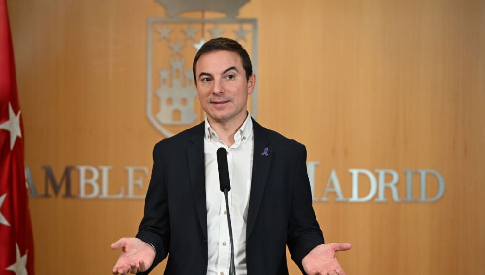 El portavoz del PSOE-M Juan Lobato comparece ante la prensa en el marco del pleno de la Asamblea de Madrid celebrado este jueves. | EFE/ Fernando Villar