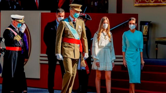 El enfado del público con Sánchez cuando se ha anunciado su nombre por megafonía ha contrastado con el recibimiento a los monarcas, que han sido aplaudidos y vitoreados. La llegada de los Reyes fue aplaudida con entusiasmo por la multitud agolpada detrás de las vallas para presenciar el primer desfile militar. En esta ocasión, Felipe VI viste el uniforme de gala de capitán general del Ejército de Tierra.