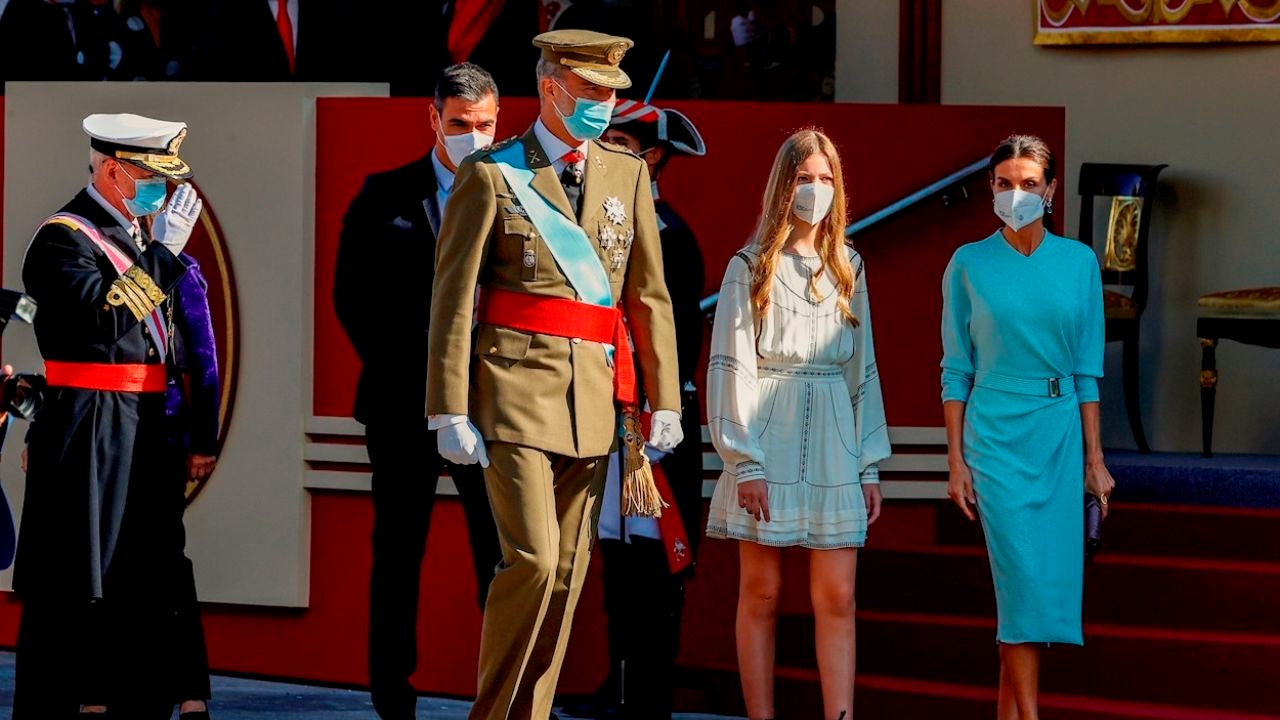 Los Reyes llegaron junto a la infanta Sofía para dar el pistoletazo de salida al desfile militar. Este año, la princesa Leonor no ha podido asistir porque ese día es lectivo en el internado de Gales donde cursa bachillerato. Durante el saludo del Rey al presidente del Gobierno, se produjeron abucheos y pitidos al grito de "dimisión". Los asistentes también gritaron y abuchearon al presidente al finalizar el acto.