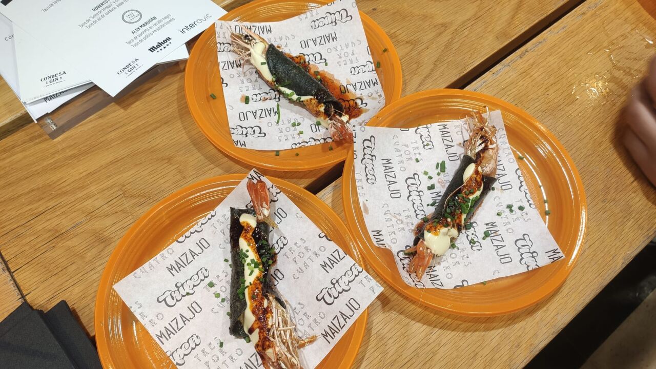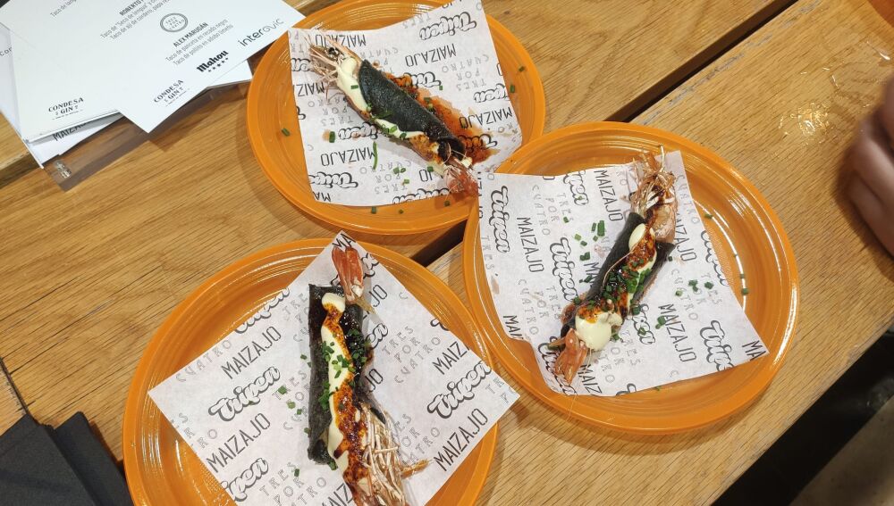 Álex Marugán, chef muy influenciado por las culinarias latinas, se ha decantado por un taco de panceta en recado negro y un taco de pollito en adobo limeño, empleando proteínas habituales a ambos lados de Atlántico.