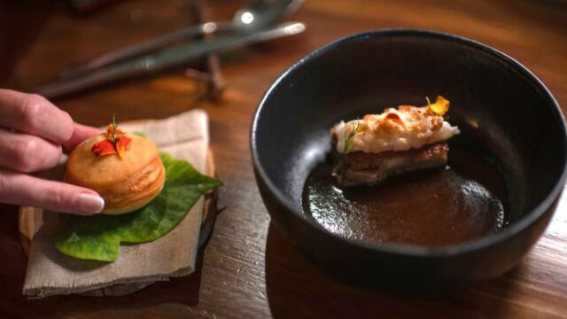 "Los productos los seleccionamos, los probamos antes y vemos si pueden encajar", explica Lucía Gutiérrez sobre las materias primas que adquieren para LUR. Lo hacen con pequeños productores como 'Sapiens Sostenible', en la zona de Rivas Vaciamadrid, que les distribuye ingredientes de huerta totalmente ecológicos. Con ellos elaboran el actual aperitivo, un caldo de verduras de temporada y trufa que acompañan de un buñuelo relleno de perdiz escabechada.