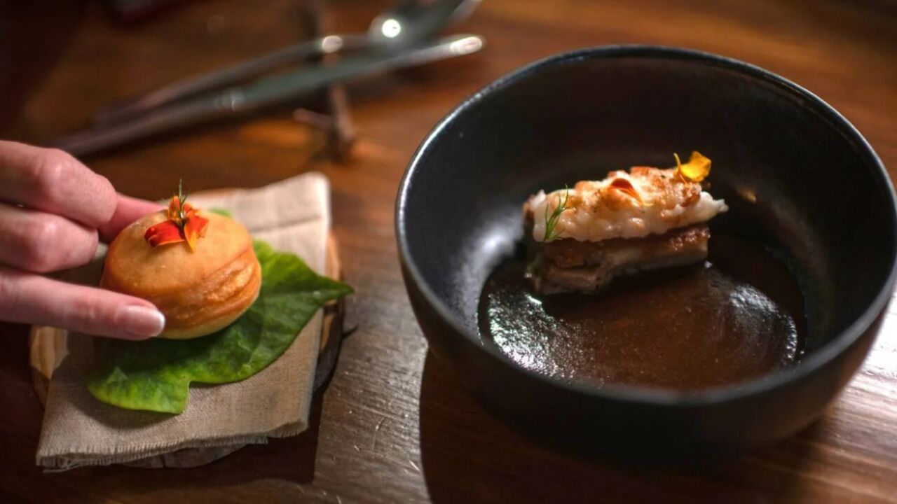 Y no hay que dejar pasar por alto el pato de tiro azulón en dos cocciones con compota de bayas silvestres, pomelo confitado y shiso, un plato para los amantes de la caza.