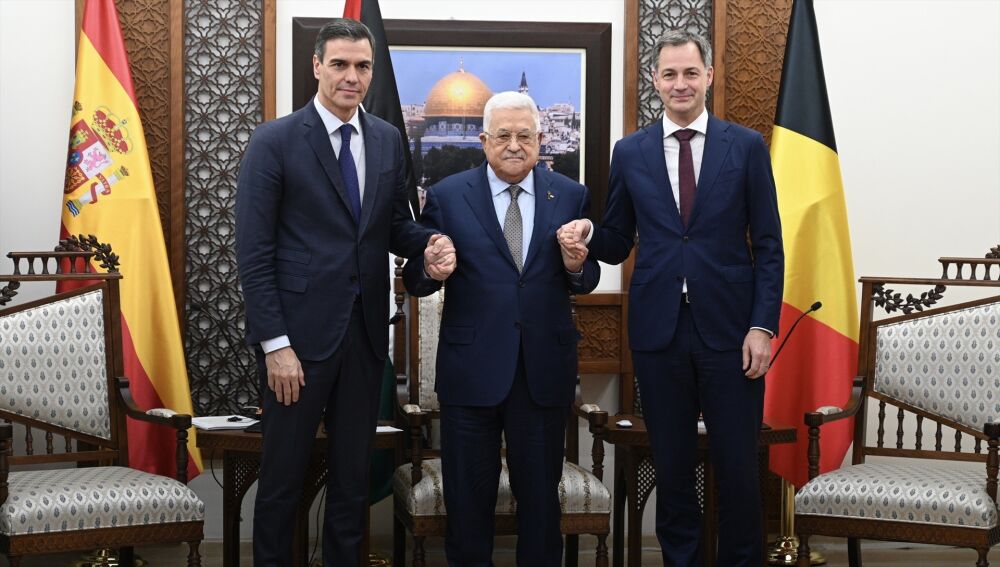 El presidente del Gobierno, Pedro Sánchez, junto al primer ministro de Bélgica, Alexander De Croo y el presidente de la Autoridad Nacional de Palestina, Mahmud Abás | Europa Press