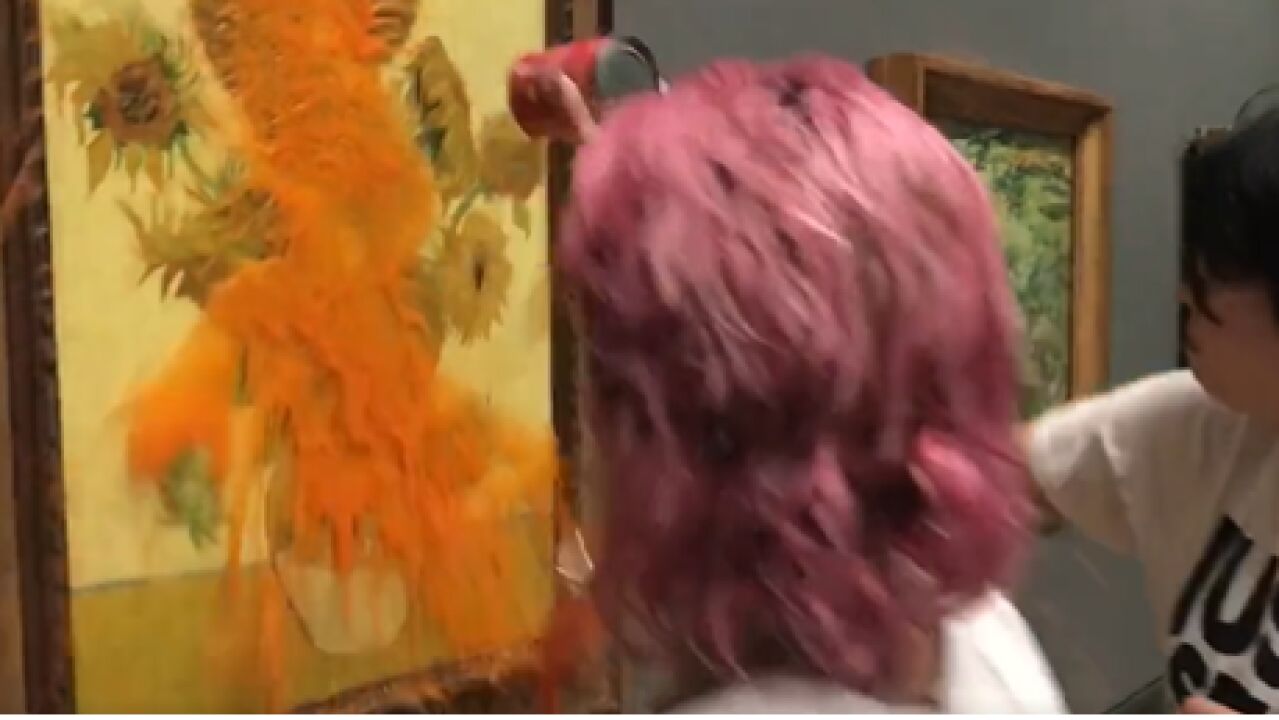 Dos activistas ecologistas han arrojado este viernes sopa de tomate sobre el cuadro 'Los Girasoles' de Vicent Van Gogh, exhibido en la National Gallery de Londres, para protestar contra la explotación de yacimientos de combustibles fósiles en Reino Unido.