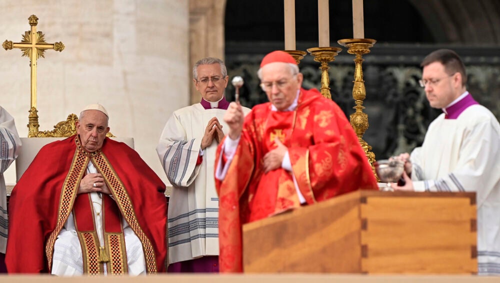 Poco antes de desaparecer de la vista de la asamblea, el Papa Francisco se puso en pie junto al féretro y, posándole la mano, le dio su bendición, en una insólita imagen de un pontífice en el funeral de su predecesor.