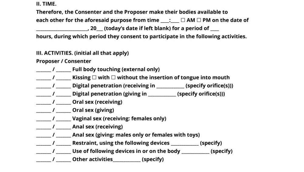 Una de las secciones más controvertidas es la que trata la posibilidad de una "violación accidental", es decir, una penetración no consentida que puede ocurrir sin intención debido a movimientos involuntarios durante el acto sexual. El contrato ofrece dos opciones: considerar el incidente como un asalto, lo que obligaría a la parte masculina a demostrar que el acto fue accidental, o tratarlo como un accidente, asumiendo el consentimiento retroactivo por parte de la persona afectada. En ambos casos, el objetivo es clarificar cómo proceder en situaciones de este tipo, protegiendo a ambas partes de conflictos posteriores.