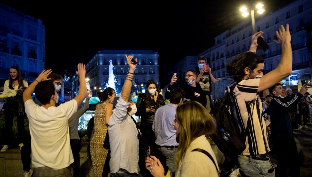 Miles de madrileños se han lanzado esta noche a las calles de la capital para festejar el fin del estado de alarma y del toque de queda, la mayoría jóvenes consumiendo alcohol en las calles ante la impotencia de la Policía Municipal que ha tenido que desalojar la Puerta de Sol.