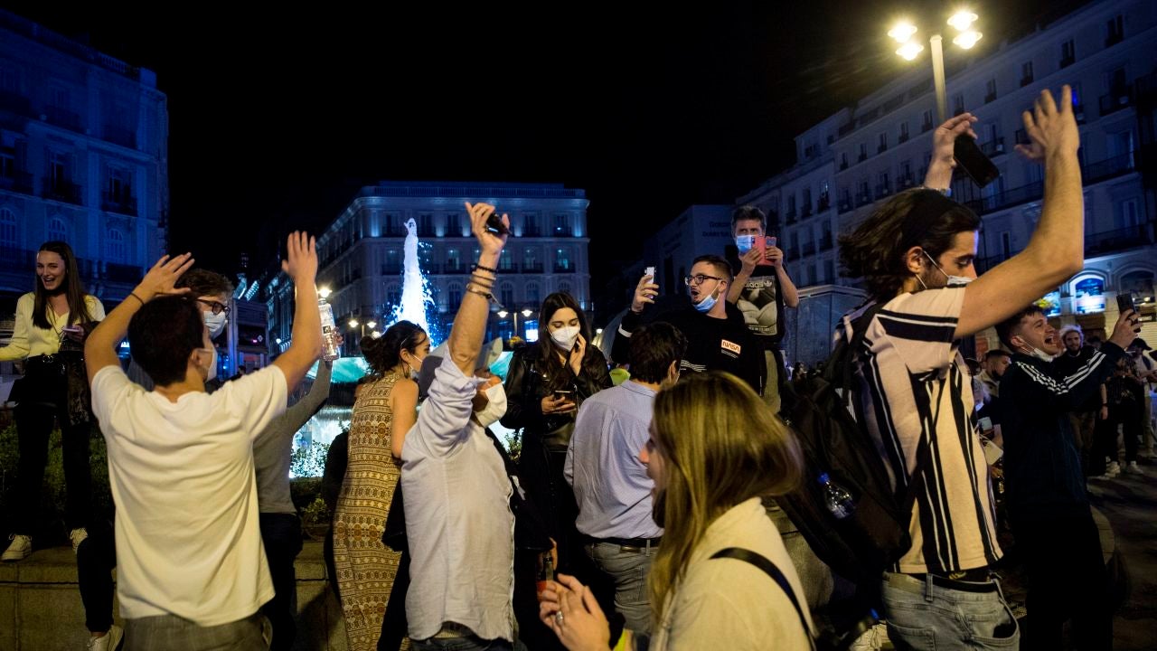 Una hora después del levantamiento del estado de alarma, en torno a 400 jóvenes, seguían bebiendo, bailando, haciendo congas ante las cámaras de televisión y gritando sin cesar “libertad” y “Ayuso”, frente a la Real Casa de Correos, la sede del Gobierno regional.