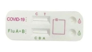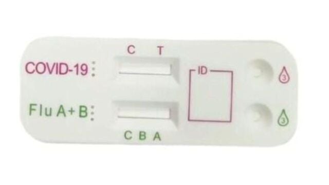 En este caso, la placa de la prueba tiene dos tiras diferentes, una en la que pone SARS-CoV y en la otra en la que pone Gripe (que detecta tanto la gripe A como la B), cada una de ellas marcadas con la C y la T, como los test de antígenos normales.