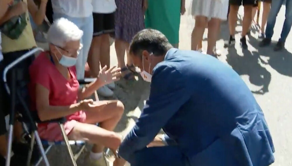 El momento más conmovedor lo ha protagonizado el presidente del Gobierno junto a Paquita, una mujer de la localidad, cuando Sánchez se ha agachado para firmarle la escayola que lleva en la pierna derecha. "Para Francisca, con cariño. Pedro", ha escrito el líder el Ejecutivo. Además, en el vídeo difundido por La Moncloa, se puede escuchar cómo un ciudadano le grita: "Paquita, en la vida te verás en otra".