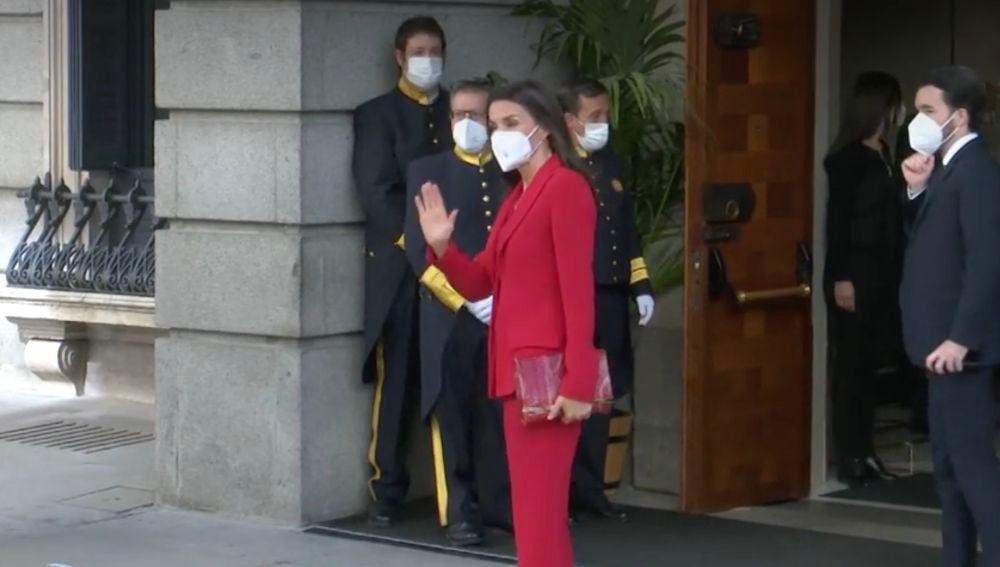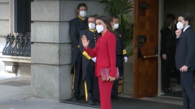 Al bajar del coche oficial, Doña Letizia, acicalada con un traje rojo, se ha aproximado a la entrada, donde sus anfitrionas aún no habían llegado, y se ha limitado a saludar a los periodistas que cubrían el evento a la espera de Llop, Calvo y Batet.