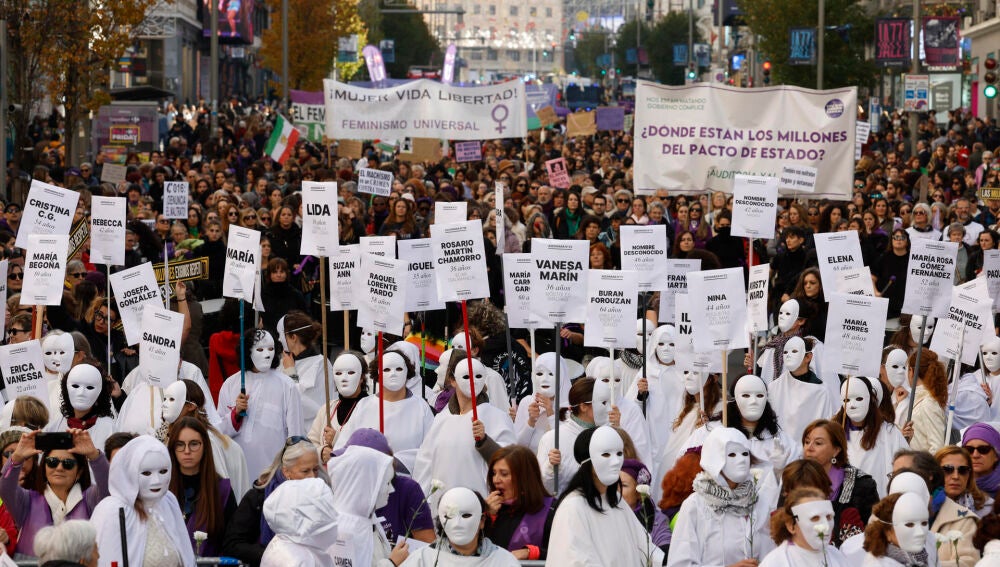 La manifestación en contra de la violencia machista con motivo del Día Internacional de la Eliminación de la Violencia contra la Mujer ha reunido a miles de personas en Madrid este mediodía.