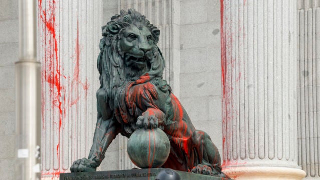 Un grupo de activistas contra el cambio climático ha protagonizado una nueva protesta a las puertas del Congreso de los Diputados. Al igual que ha sucedido en otras ocasiones, los manifestantes han arrojado pintura, en este caso roja, contra una de las columnas de la fachada, así como contra uno de los leones.