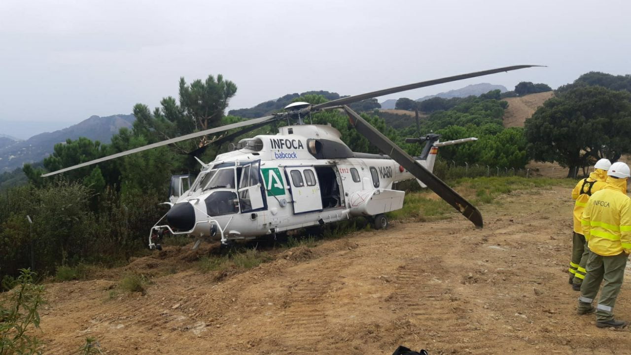 Uno de los helicópteros Superpuma del Plan Infoca ha sufrido este lunes un accidente durante las labores de extinción del incendio en Sierra Bermeja. En el aparato viajaban 19 personas y todas ellas se encuentran bien y sin daños.