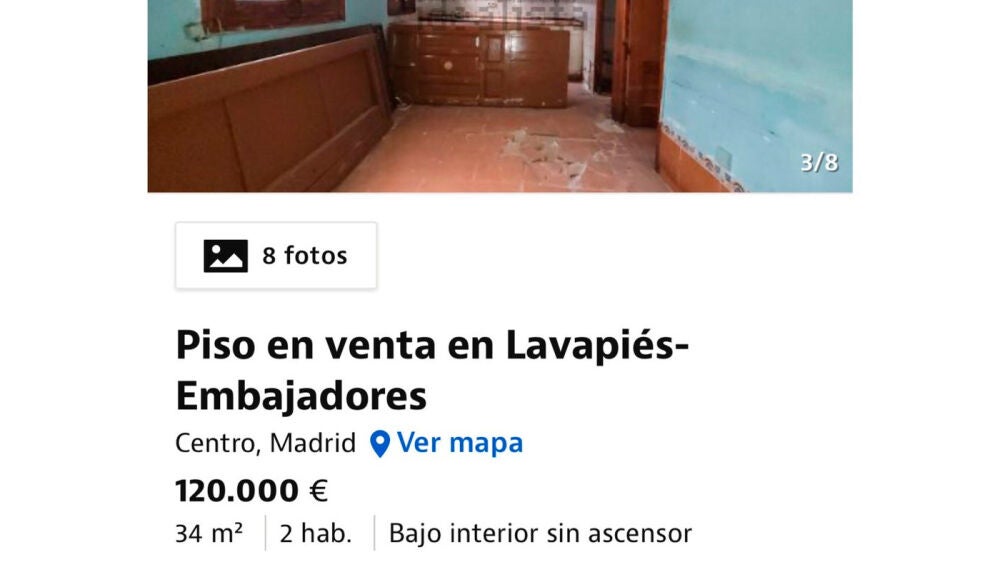 Se trata de un bajo interior de 34m2 en el barrio de Lavapiés de la capital madrileña que lo presentan como una "magnífica oportunidad para inversores" con dos habitaciones, un baño y "de segunda mano/para reformar", que se vende por el módico precio de 120.000 euros. Además, se adjuntan 8 fotografías de la vivienda que son espeluznantes, con unos mensajes inquietantes y unos grafitis que dejan mucho que desear del piso.
