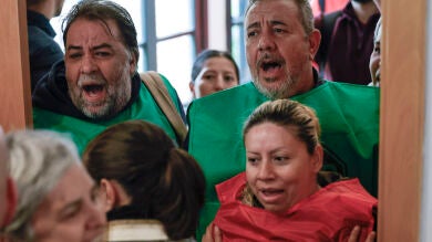 Con gritos como "la ley de vivienda es una mierda" y "hoy firmáis, mañana desahuciáis", los manifestantes han sido poco después expulsados de la sala por efectivos de seguridad.
