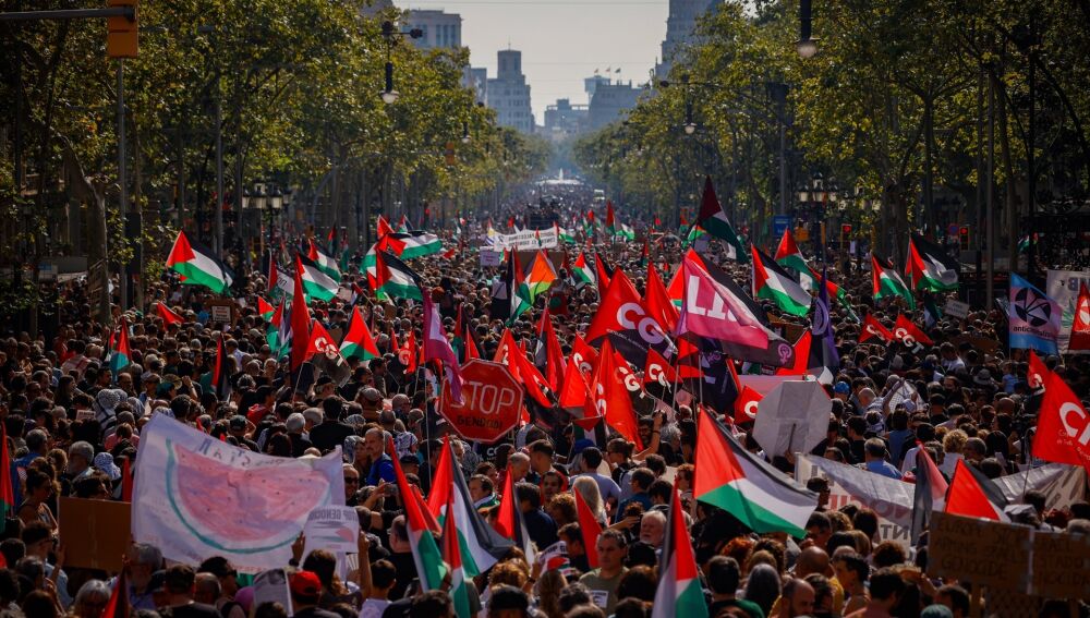 Miles de personas han salido a las calles de Barcelona, Madrid, Valencia, Pamplona, Logroño o Murcia para pedir el fin del "genocidio" en Palestina y exigir al Gobierno la ruptura de relaciones con Israel. Tras el asalto a la Global Sumud Flotilla, estaban convocadasunas 70 manifestaciones por todo el país.