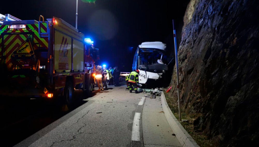 El autobús golpeó contra una cornisa junto a la carretera cerca del municipio de Porté-Puymorens, en plenos Pirineos, cerca del Principado de Andorra, según los primeros elementos de la investigación.