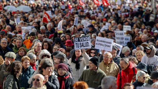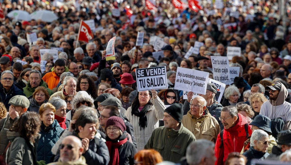 Miles de personas se han manifestado este domingo contra la política sanitaria del Gobierno de Isabel Díaz Ayuso. La manifestación, convocada por sindicatos y asociaciones vecinales, ha contado con la presencia de unas 8.000 personas, según ha indicado la delegación del Gobierno de Madrid.