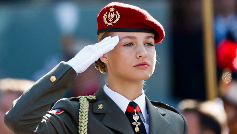 La princesa Leonor ha vestido por primera vez el uniforme militar en el día de la Fiesta Nacional para seguir desde el palco de honor junto a los reyes el desfile del 12 de octubre en Madrid, cinco días después de su jura de bandera en la Academia General de Zaragoza.
