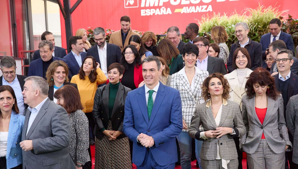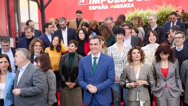 La nueva portavoz del PSOE, Esther Peña; el secretario de Organización del PSOE, Santos Cerdán; la presidenta del PSOE, Cristina Narbona; el presidente del Gobierno, Pedro Sánchez; la vicepresidenta Primera del Gobierno y Ministra de Hacienda, María Jesús Montero y la ministra de Igualdad, Ana Redondo, posan tras la reunión de la Comisión Ejecutiva Federal, en la sede del PSOE en Ferraz. | Jesús Hellín / Europa Press