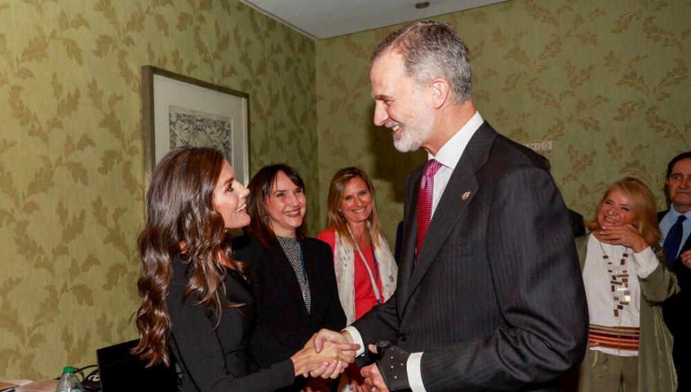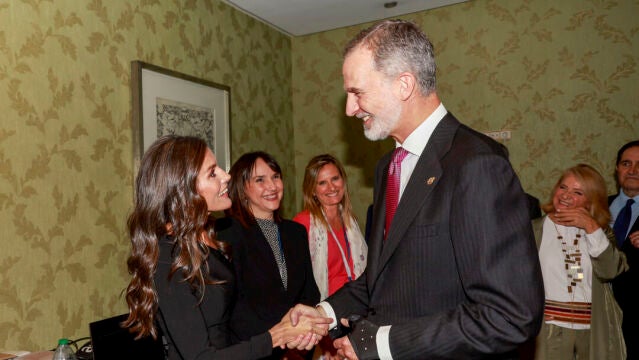 La Casa del Rey ha divulgado una fotografía en la que se ve a Felipe VI estrechar la mano de la reina Letizia en el hotel Reconquista de Oviedo, una imagen similar a la del primer saludo que ambos protagonizaron hace 20 años en el mismo lugar, cuando entonces era periodista de TVE, días antes de que se anunciara su noviazgo.