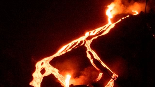 El volcán de La Palma ha sufrido este sábado, en su día 34 de erupción, un nuevo derrumbe parcial en su cono principal y ha seguido generando grandes derrames de lava que alimentan las coladas en su descenso valle abajo, donde sigue preocupando la suerte que correrá el barrio de La Laguna.