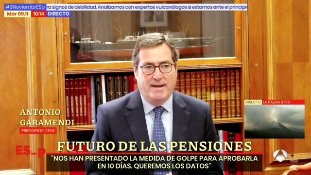 Respuesta de los empresarios a la última propuesta del ministro Escrivá. Subir no ya el 0,5% sino el 0,6% las cotizaciones sociales para pagar las futuras pensiones. El Presidente de la CEOE, Antonio Garamendi, se ha quejado de que la propuesta se presente de golpe y se exija a los agentes sociales respuesta inmediata. Pide más tiempo para analizarla y sostiene además que sería un golpe duro para las pequeñas y medianas empresas, imposible de aplicar en muchos casos.