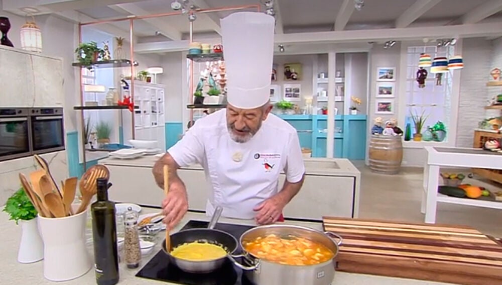 El plato es una tortilla de arroz crudo para acompañar un guiso típico de Castellón. El 'toque final' de esta comida que ha sorprendido al cocinero vasco: "es la primera vez que lo hago y me parece un espectáculo".