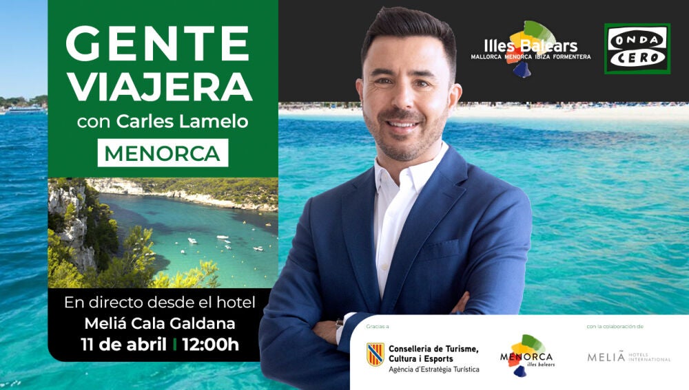 La isla de Menorca se convierte este sábado 11 de abril en el nuevo destino de Gente Viajera, que estará en directo emitiendo un programa especial en el hotel Meliá Cala Galdana. Desde las 12:00 del mediodía, Carles Lamelo y su equipo trasladan a los oyentes hasta una de las joyas del Mediterráneo para conocer de primera mano toda la oferta turística que ofrece la isla en este arranque de la temporada 2026.