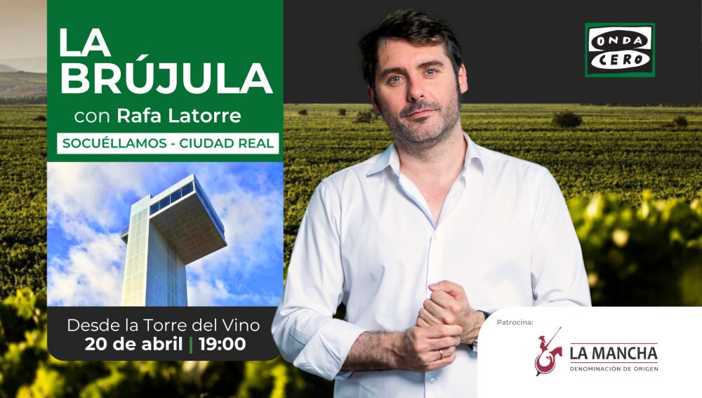 Este lunes 20 de abril, 'La Brújula' de Rafa Latorre mira hacia el “mar de viñas” de La Mancha desde el emblemático mirador de la Torre del Vino de Socuéllamos, un espacio que refleja la identidad vitivinícola y cultural de la región. En un programa abierto al público, en directo desde las 19:00 horas.