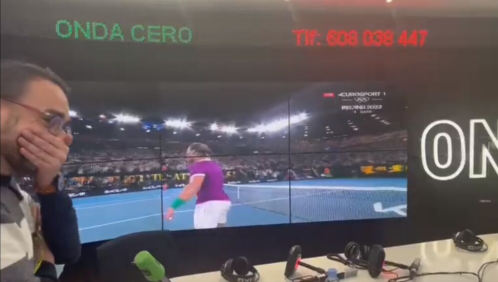 Así vivió Edu García los instantes finales: el director de 'Radioestadio', en pie y con la tensión del punto final, acabó con lágrimas para celebrar la victoria de Rafa Nadal.